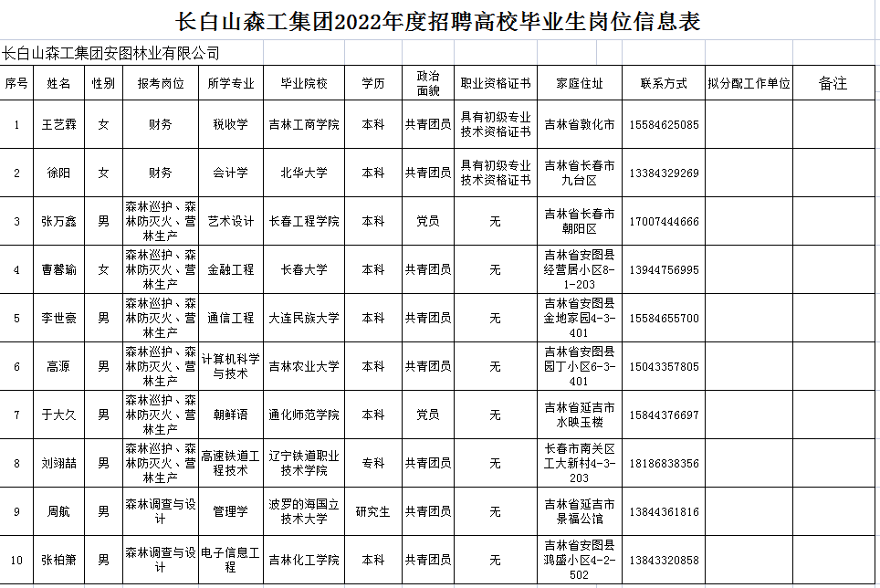 安圖林業有限公司 2022年度招聘高校畢業生崗位信息公示